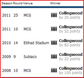 This game is the biggest test we face this season. We have a terrible record against Collingwood in recent years and an equally as bad record at the MCG. One could argue these two records are just symptomatic of the fact that for a few seasons (2008-10) we were atrocious.